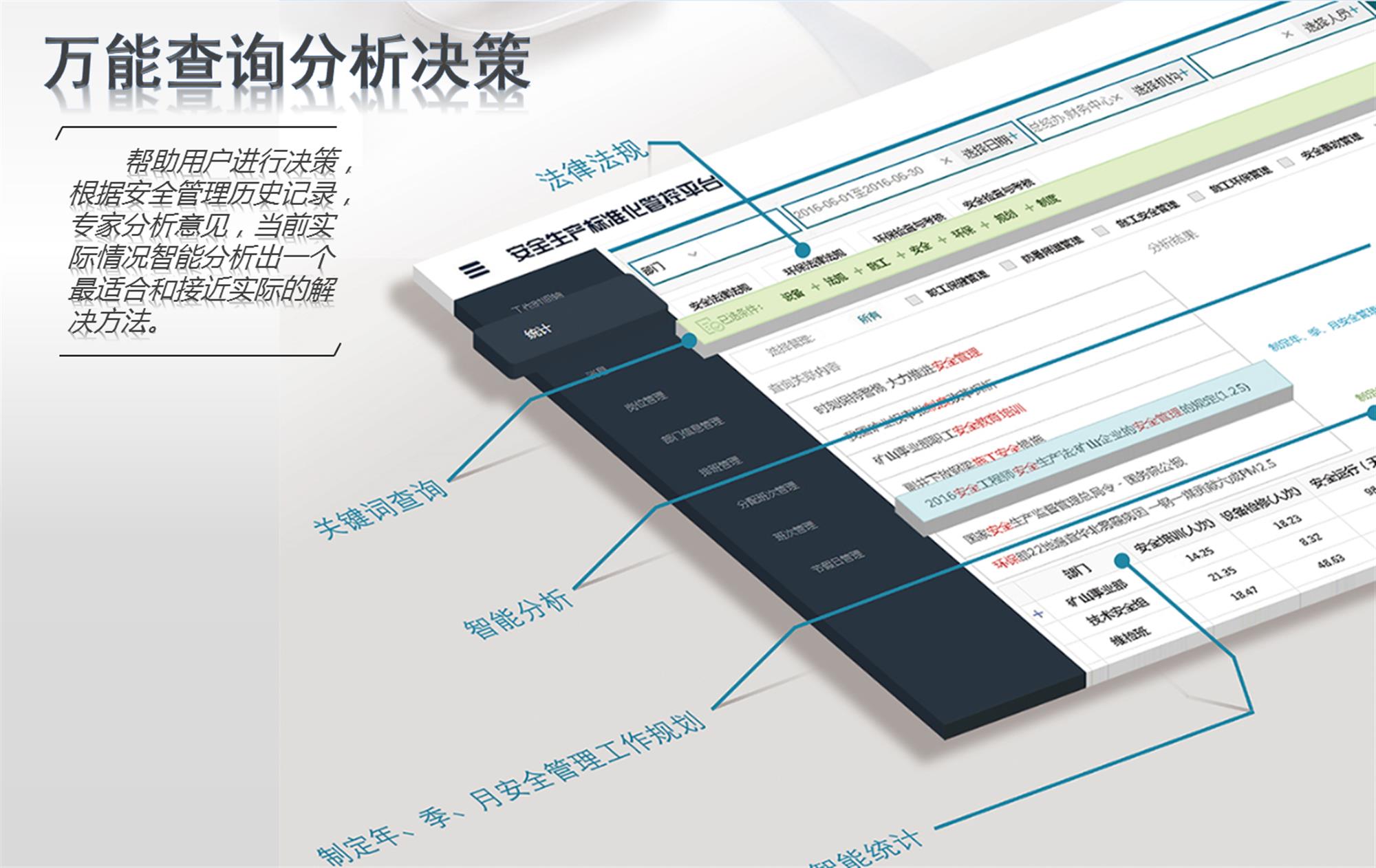 安全生產(chǎn)標(biāo)準(zhǔn)化管控平臺(tái)是遼寧聚進(jìn)科技有限公司智慧企業(yè)建設(shè)的一個(gè)重要部分;是實(shí)現(xiàn)業(yè)務(wù)規(guī)范化、過(guò)程標(biāo)準(zhǔn)化、管控智能化、績(jī)效分析自動(dòng)化的行業(yè)領(lǐng)先的應(yīng)用平臺(tái)系統(tǒng);該平臺(tái)以國(guó)家安全法律法規(guī)、相關(guān)政策為基礎(chǔ),以企業(yè)崗位責(zé)任制度為參照,采用B/S應(yīng)用架構(gòu)、大型數(shù)據(jù)倉(cāng)庫(kù)技術(shù)、移動(dòng)終端互聯(lián)網(wǎng)開(kāi)發(fā)技術(shù)、“仿真三維”數(shù)字建模技術(shù)、GIS應(yīng)用技術(shù)以及大數(shù)據(jù)挖掘技術(shù)等領(lǐng)先科研成果與技術(shù)研發(fā)而成,為企業(yè)提供自下而上的一線(xiàn)安全管理作業(yè)數(shù)據(jù)。